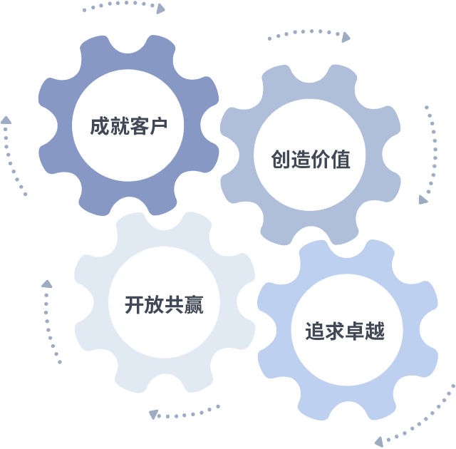成就客户是一切决策的出发点,,,,创造价值是衡量所有工作的标准,,,追求卓越是开元体育做事做人的态度,,,,开放共赢是开元体育的格局也是最终的结果。。。。价值观的齿轮环环相扣,,推动着组织里的每个人不断向前。。
